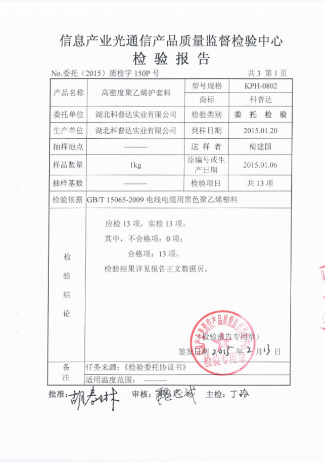 科普達產品主要有各種光纜護套料,榮獲湖北省名牌產品,守合同重信用企業。 榮獲多種國家資質認證包括:ISO9001質量管理體系認證、ISO14001環境管理體系及OHSAS18001職業健康安全管理體系認證。...